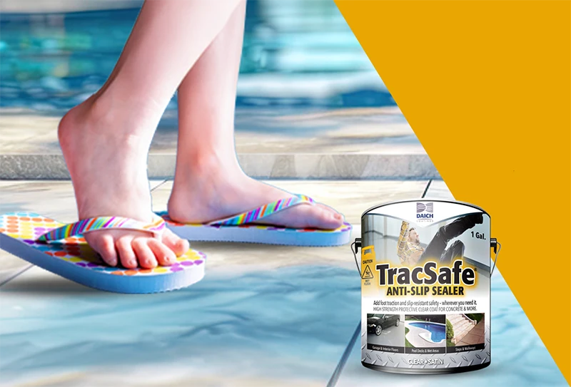 Now you can add more foot traction and safety to all kinds of slippery surfaces indoors and out with TracSafe® Anti-Slip Sealer by Daich Coatings. It’s a unique pre-mixed formula that’s ready to apply wherever you need it. TracSafe® locks firmly onto all kinds of flooring materials, indoors and out. From concrete, patio stones and pavers, to slippery fieldstone, linoleum and even ceramic tile, you can make numerous slippery surfaces safer in just a day.