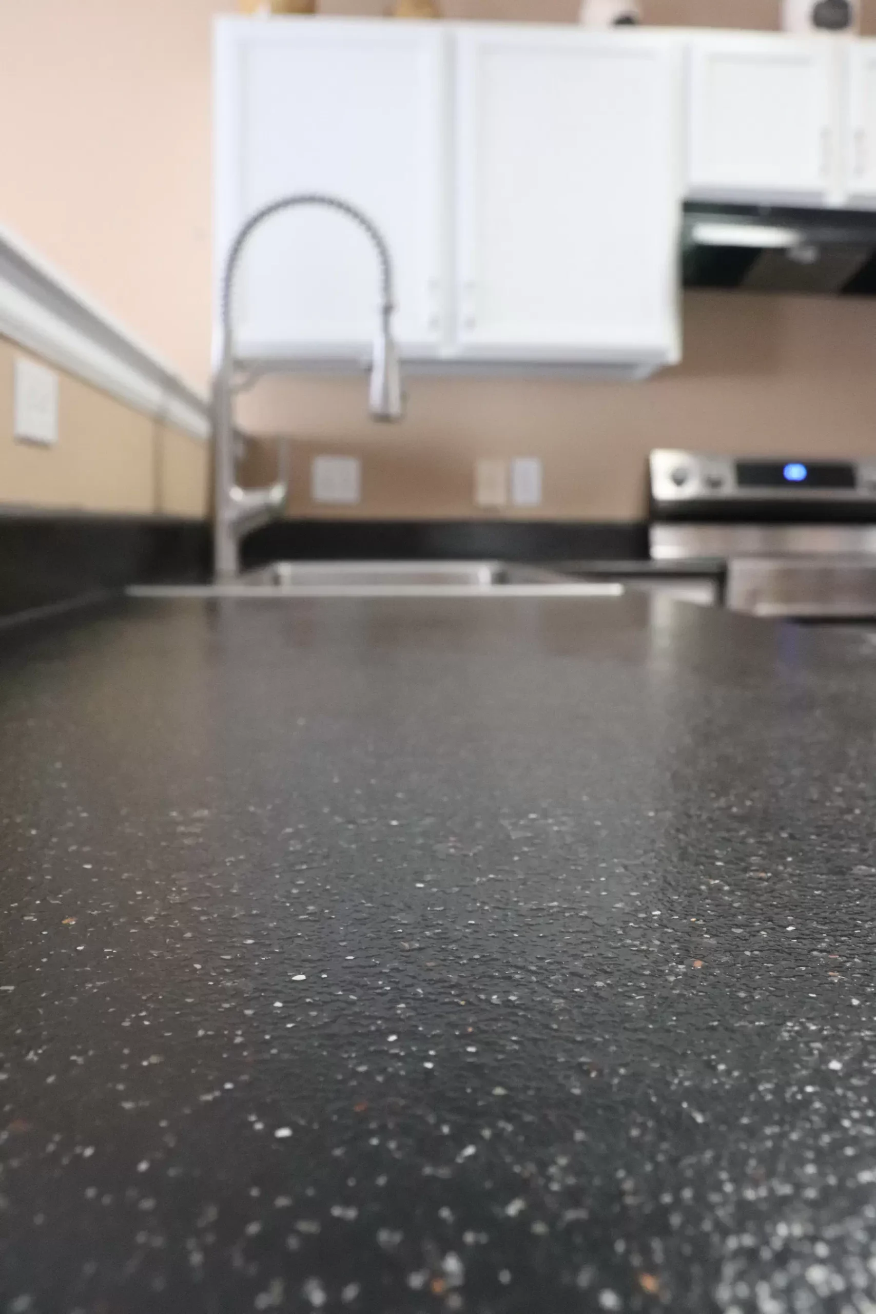 “We are very pleased with the final results,” says Curtis. “The contrasting colors of the stones and texture in the Volcanic Black created depth against the dark background. This complements the cabinets and wall color, providing us with a good-looking kitchen. All at a very low cost of $144 for a countertop kit. And, by reusing the old Formica® countertops instead of replacing them, the project was both economically and environmentally friendly!”
