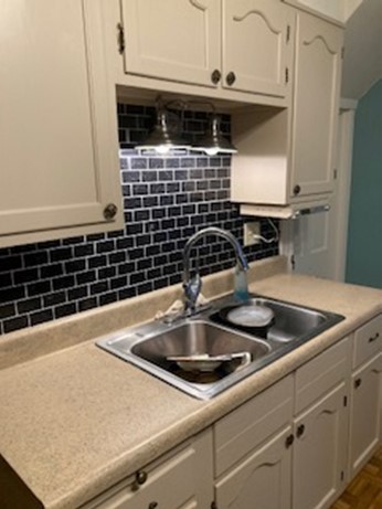 Project #5: Carolyn Davis of Graceton, Pennsylvania – Canyon Gold color. We have an old historic (1889) home. We covered the 1970s white speckled countertops with the SpreadStone product, added a black backsplash and painted the cabinets to reflect a more traditional, timeless look. Since our countertops are not standard sizes, replacing them would have been very expensive. The Daich Coatings kit was the perfect solution. We even covered the portable dishwasher butcher-block top and the top of the radiator to match. We love it all!”